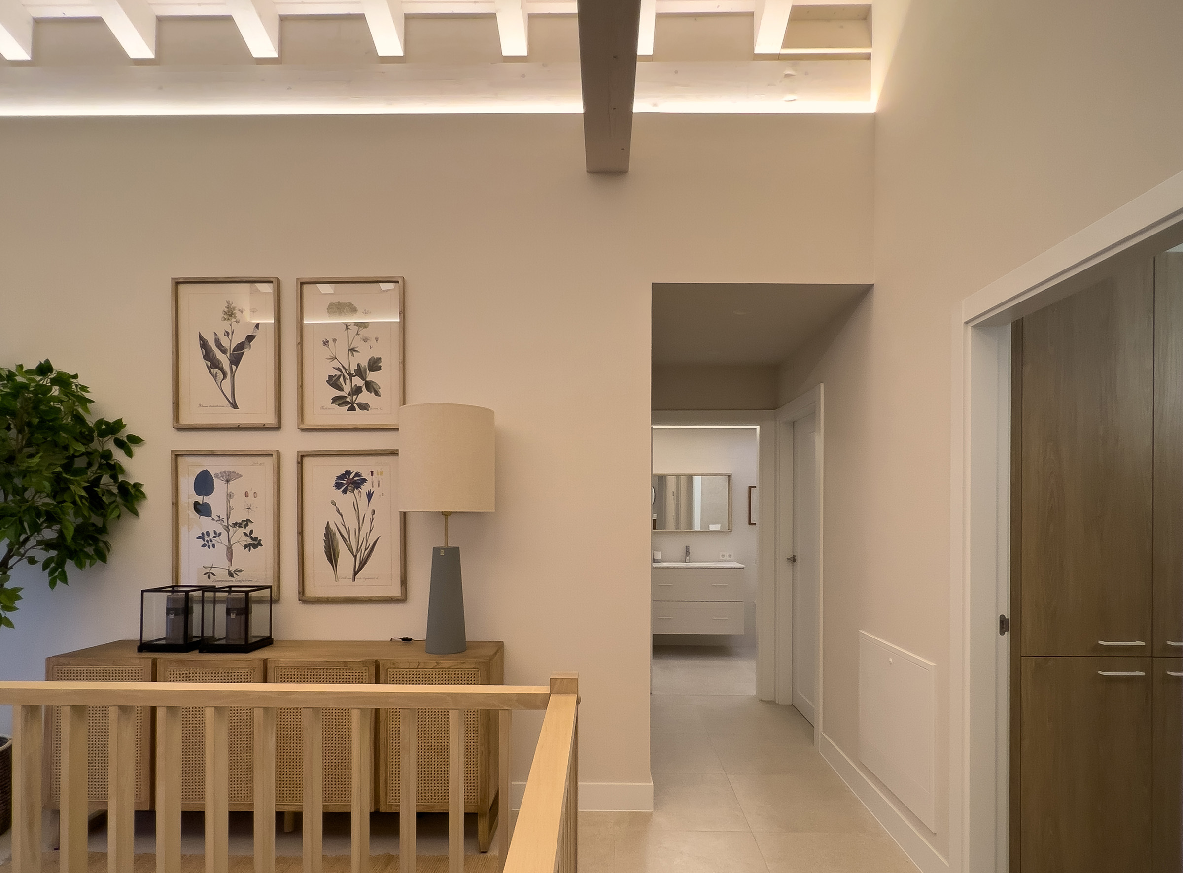 Una fantástica escalera abierta con un techo abuhardillado en blanco y luz indirecta es el corazón de todo… la que te adentra a la segunda planta donde se distribuyen los dormitorios y una maravillosa zona de lavado, sueño de muchos…
