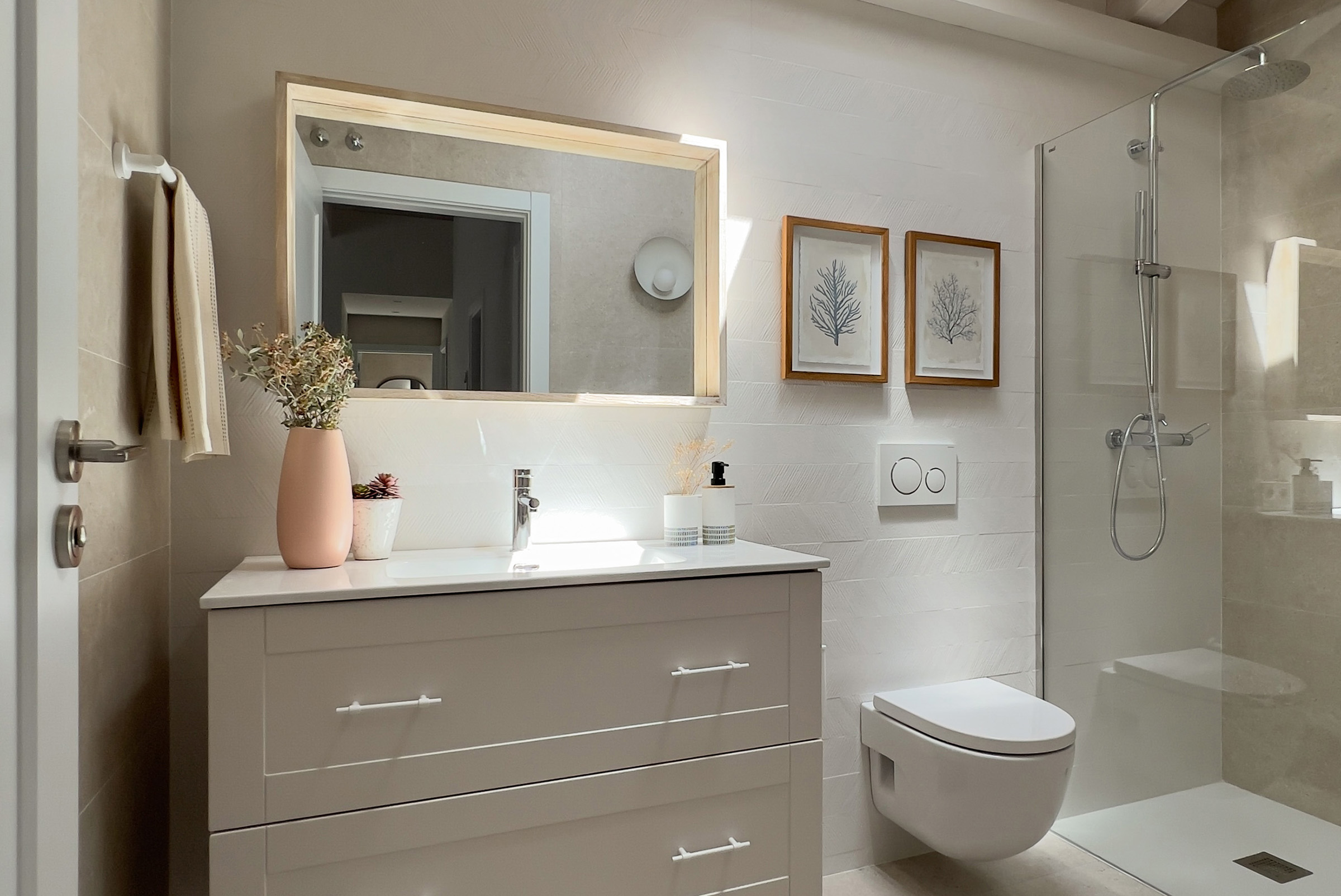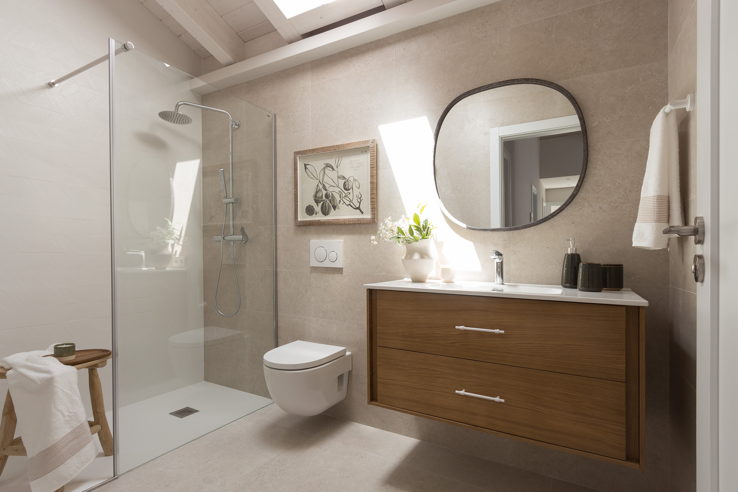 Cada dormitorio juvenil trabajado desde los colores «favoritos» de sus ocupantes, con amplias camas para el descanso y escritorios donde realizar sus trabajos y mejores creaciones… colores empolvados y mezclas de linos y algodón que siempre tamizan de forma diferente. Entre ellos un bonito baño con concepto juvenil, mueble de CODIS BATHy cerámica en espiga de KERABEN haciendo del frente un diseño atemporal y acogedor. Luz cenital que siempre le aporta encanto…