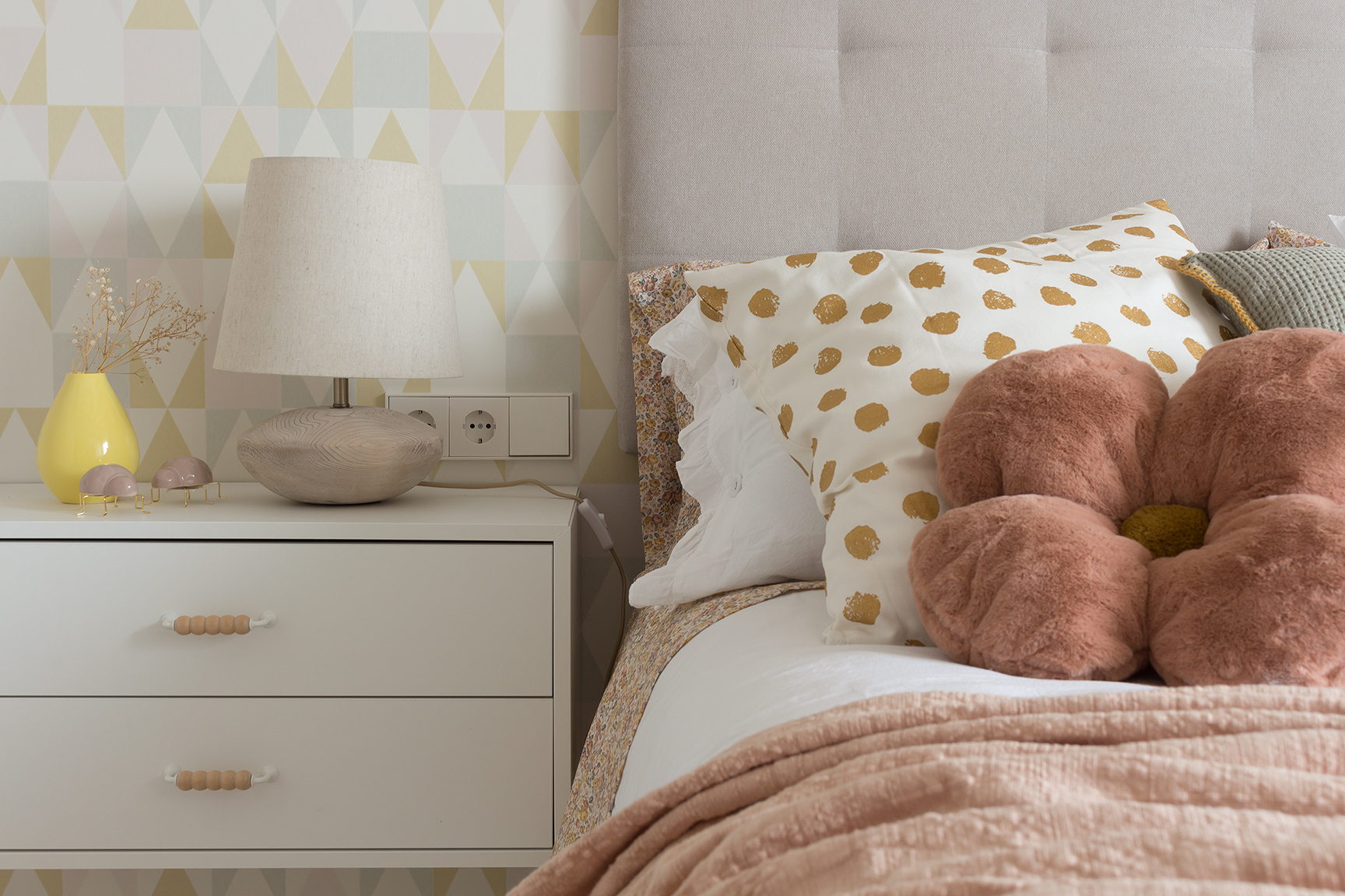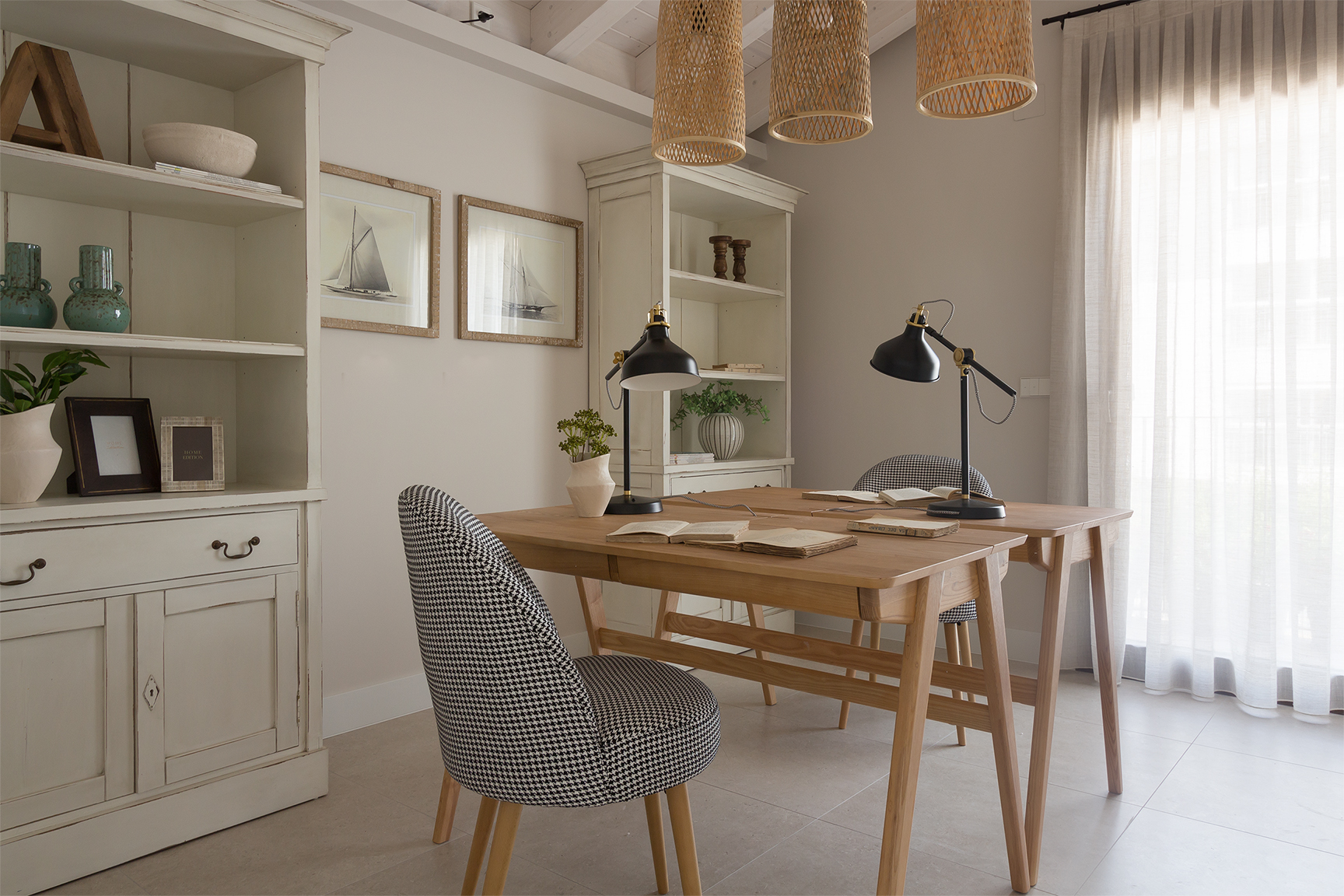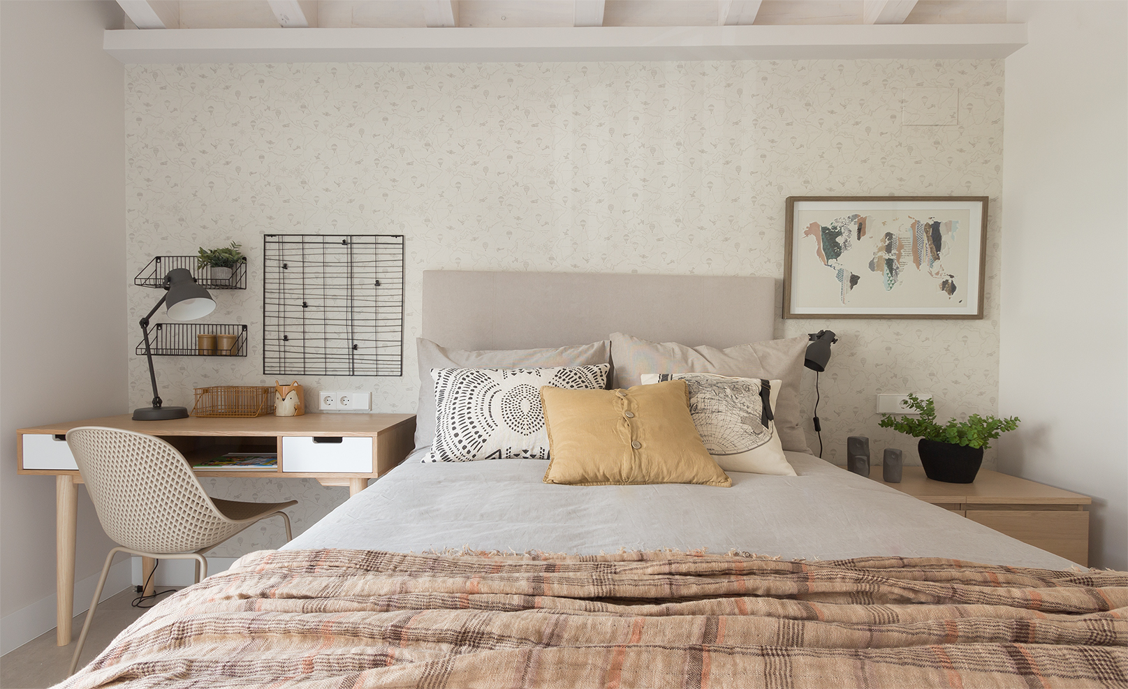 Al frente la zona de estudio para el teletrabajo tan integrado en nuestras vidas y como separación un baño diseñado con la misma cerámica espiga de los niños para la zona de ducha, mueble en madera de CODIS BATH y textiles de ZARA HOME.
