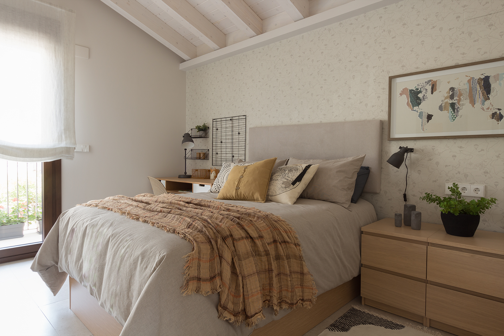 El dormitorio principal con toques en verde como color protagonista, tostados, marrones y beige ayudando al descanso. Y  a pie de cama el vestidor personalizado con diseño fabricado a medida en laca al tono de la pared. Frente en papel texturizado de CASAMANCE que siempre es un acierto. Mesillas en verde como punto diferente y lámparas personalizadas creacionista de MAROCHA.