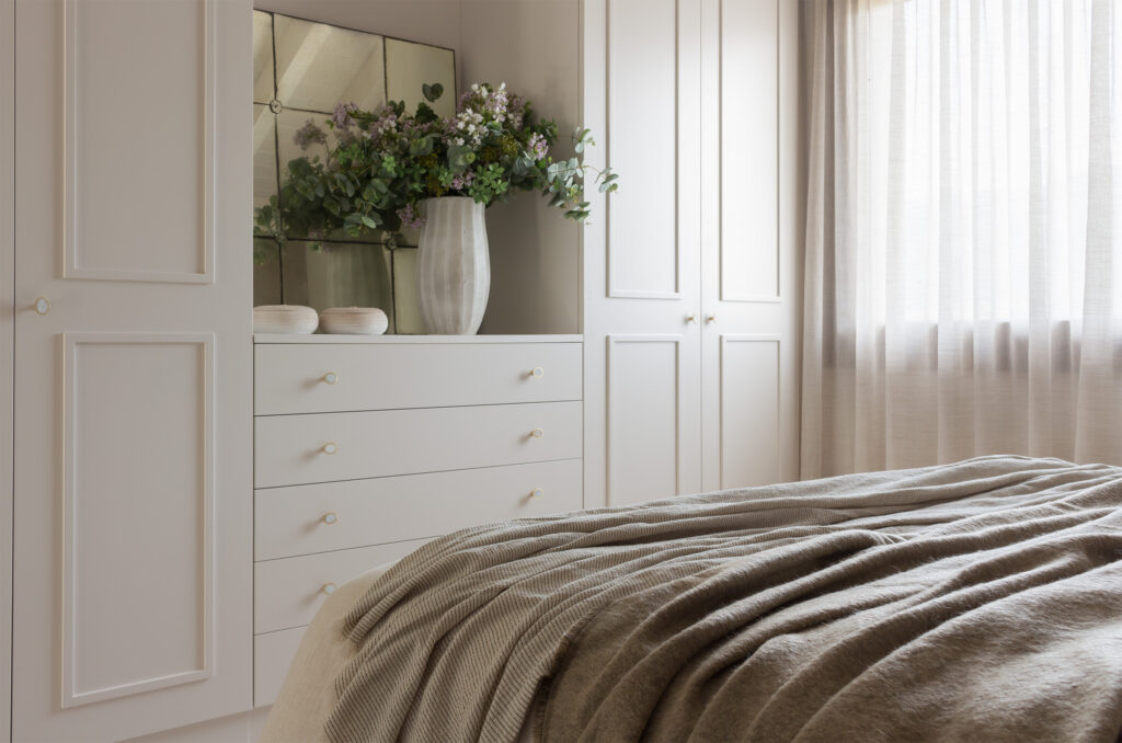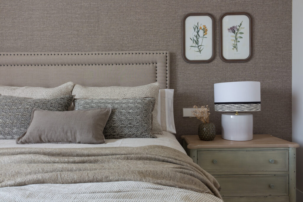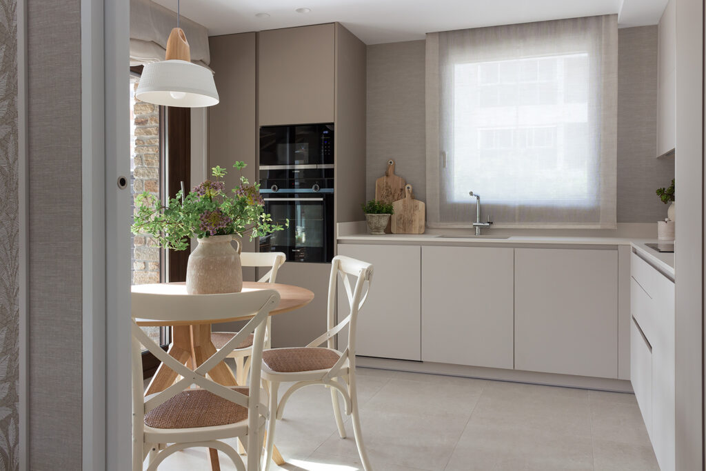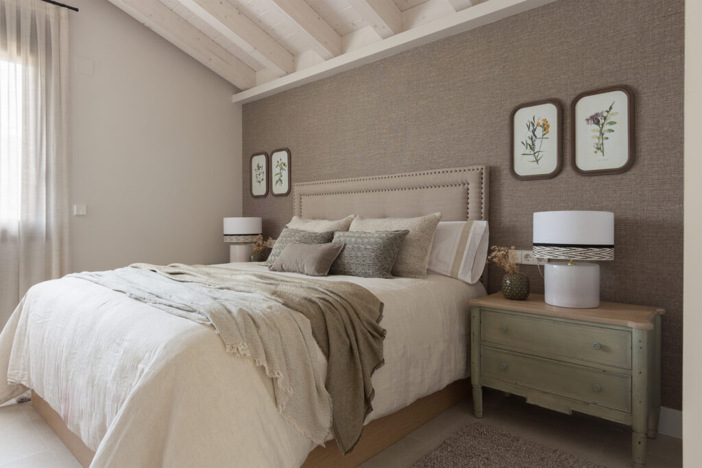 El dormitorio principal con toques en verde como color protagonista, tostados, marrones y beige ayudando al descanso. Y  a pie de cama el vestidor personalizado con diseño fabricado a medida en laca al tono de la pared. Frente en papel texturizado de CASAMANCE que siempre es un acierto. Mesillas en verde como punto diferente y lámparas personalizadas creacionista de MAROCHA.