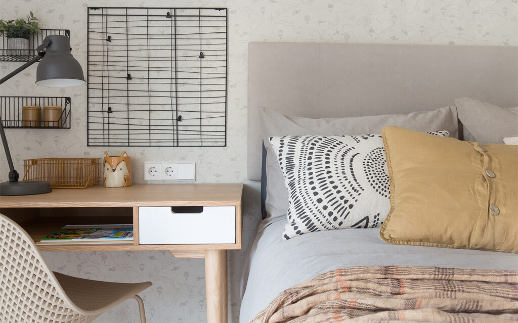 Al frente la zona de estudio para el teletrabajo tan integrado en nuestras vidas y como separación un baño diseñado con la misma cerámica espiga de los niños para la zona de ducha, mueble en madera de CODIS BATH y textiles de ZARA HOME.