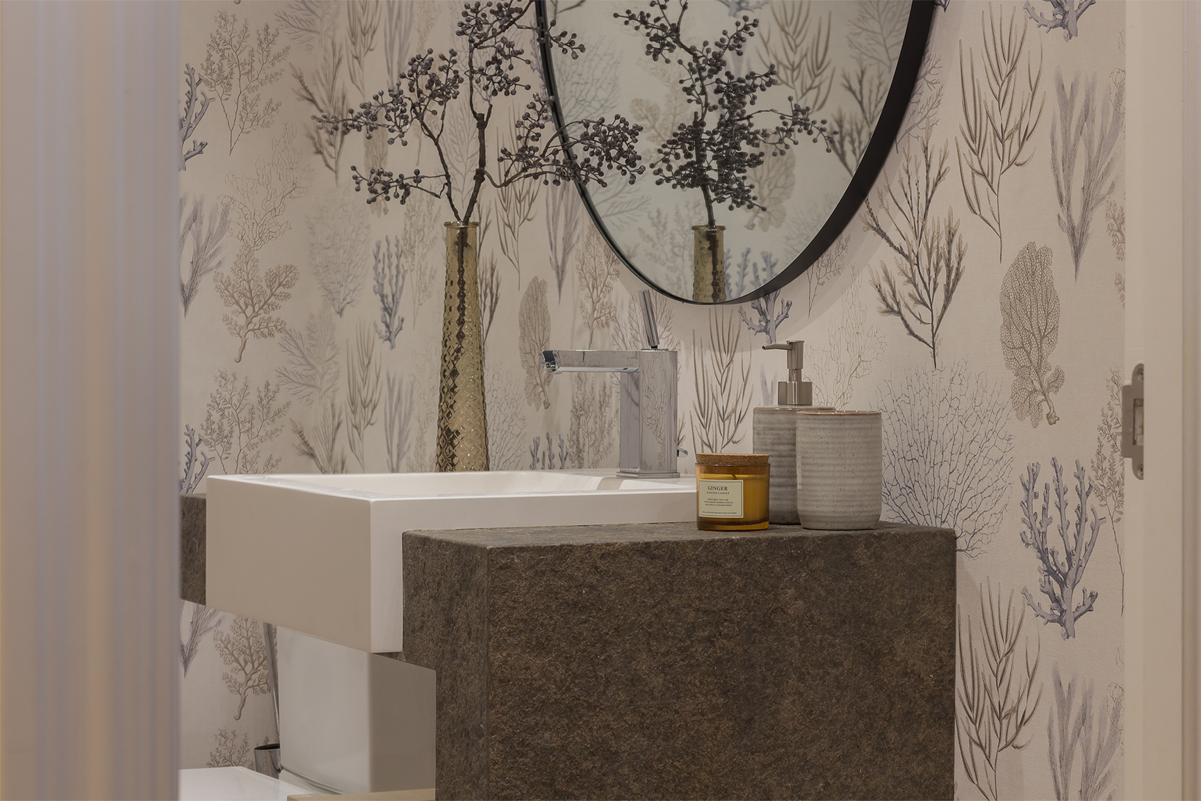 El aseo no terminaba de gustarle y conseguimos darle un giro importante con la colocación de un estupendo papel vinílico con estampados corales. Mismo mueble y sin tocar pavimento, únicamente se modificaron los accesorios y el espejo, pasando a ser otro completamente.