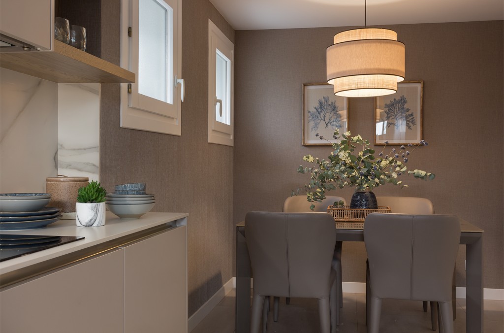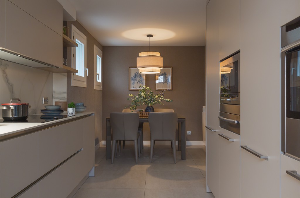 La cocina también estaba colocada, pero necesitaba modificar imagen y una zona de comedor mucho más acogedora que la original. Con un cambio de encimera por otra beteada en DEKTON y un papel textura de la firma CASAMANCE en la zona de comedor, se consiguió un espacio más agradable y acogedor. La iluminación, que en origen era un foco downlight totalmente frío sobre la mesa, pasó a ser una pantalla artesanal y con diseño propio, de luz cálida de la firma MAROCHA.