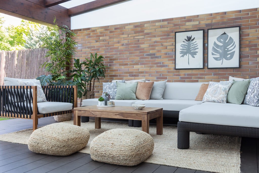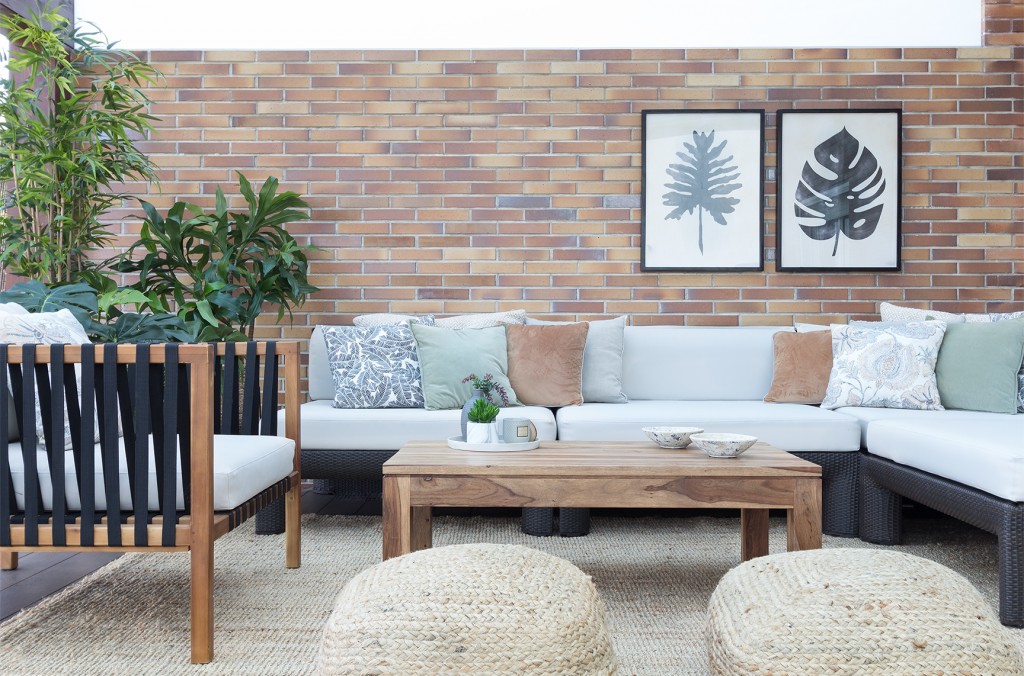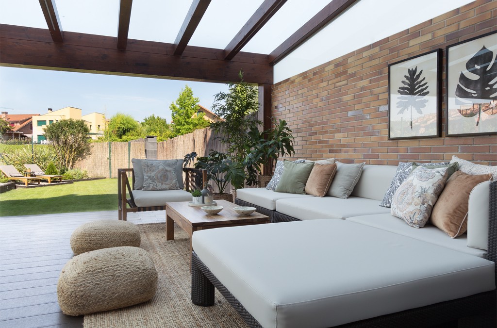 El porche como punto estrella, que no terminaba de «coger el aire» y que dado el confinamiento, pasaba a ser uno de los puntos principales de la casa… cambió totalmente con la composición de cojines, la suma de auxiliares en maderas naturales, texturas en sisal, algodones y rafias muy características de exterior.